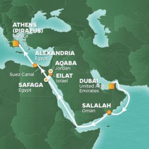 Next, we make for the modern marvel of engineering with passage through the Suez Canal en route to the Mediterranean. Check a visit to the pyramids off your bucket list in Alexandria, and take a selfie with the Sphinx. Your voyage concludes in Europe’s oldest city, Athens, where you may want to stay for a few days before heading home. Of course, you could probably spend a lifetime in Athens and not see everything it has to offer.