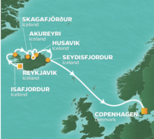 | Tue 16/ Wed 17 | Reykjavik, Iceland | Embark/Docked | 10pm (Aug 17) | |